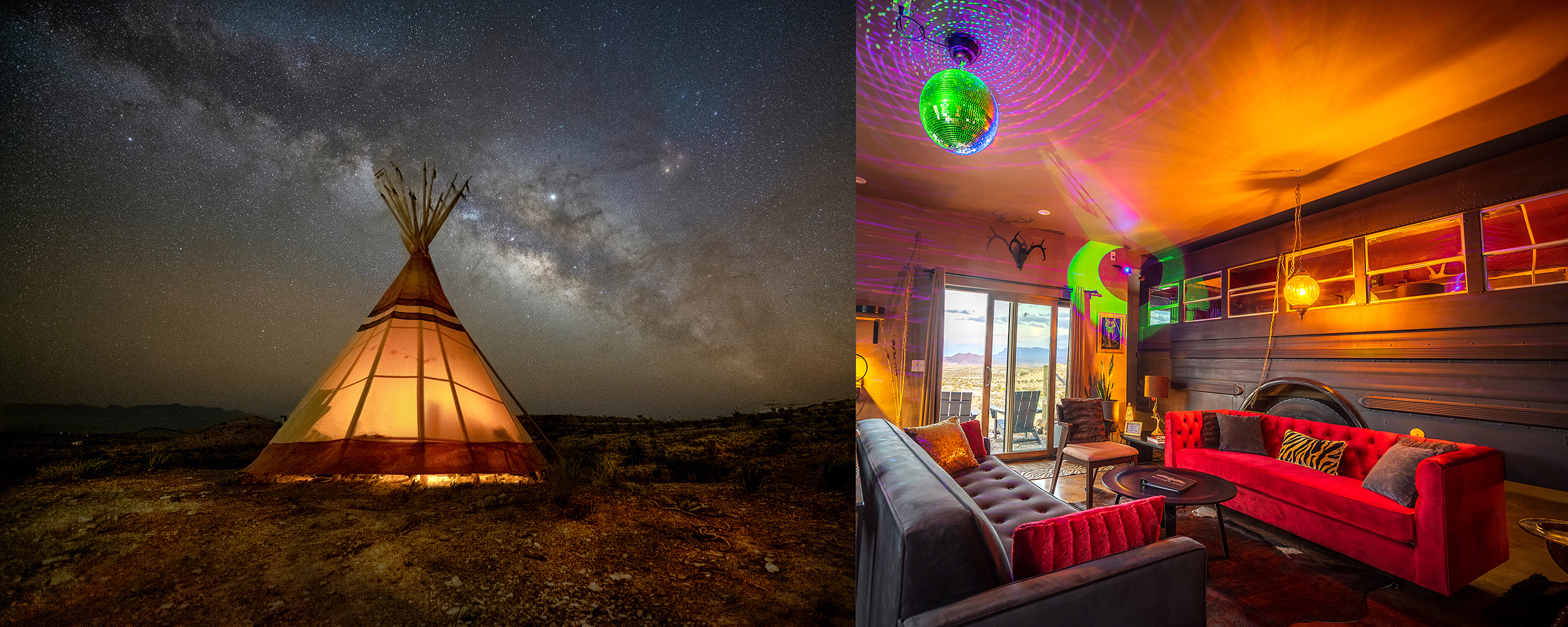 Located in the heart of Terlingua – walking distance to the historic Terlingua Ghost Town and just minutes from Big Bend National Park, The Buzzard’s Roost is a collection of three, fully furnished tipis and a cozy, eclectic, 2-room tiny house.